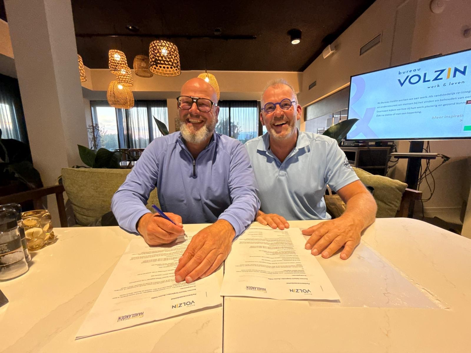 Foto: Mark Kastelein (l) van Bureau VolZin en Leonard van Spronsen (BNH) tijdens de ondertekening van het BNH-partnercontract (fotocredits: Wesley van Heugten)