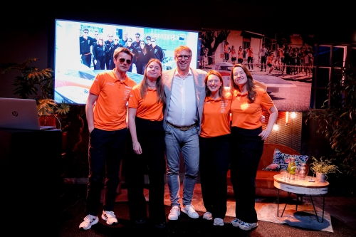 Foto: sponsor Ernest Linneweever in het midden tussen het Delft Solar Team 2024, twee jaar geleden.